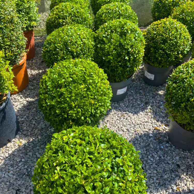 - Planting Conditions: Box Buxus Ball Topiary thrives in well-drained soil with a neutral to slightly alkaline pH. It prefers a sheltered spot with full sun to partial shade. Avoid waterlogged or very dry conditions, and ensure good air circulation to reduce the risk of box blight. Regular watering is essential during dry spells and in the first year after planting.