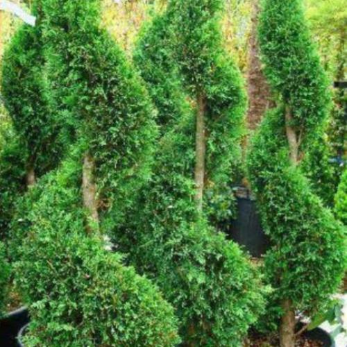 The Castlewellan Gold Spiral Cypress is a striking evergreen conifer known for its unique spiral growth and vibrant golden yellow foliage.