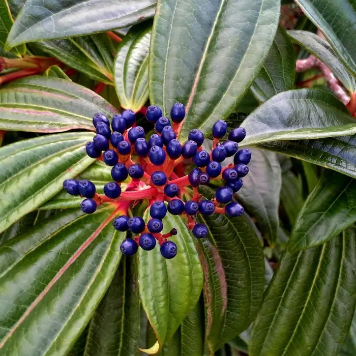 Viburnum davidii is a small spreading evergreen shrub, with deep green, leathery leaves. Flattened heads of small dull white flowers produce in May and long-lasting 'metallic' blue-black berries grow in autumn and winter