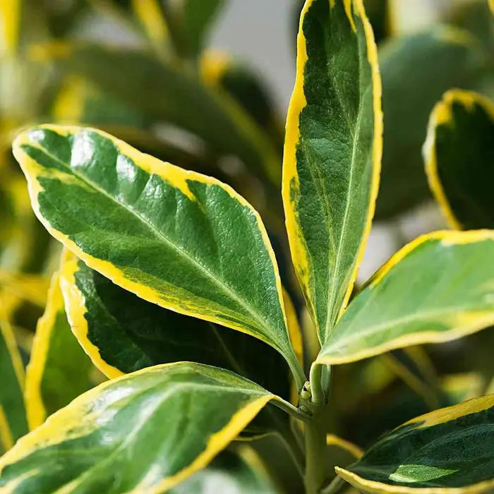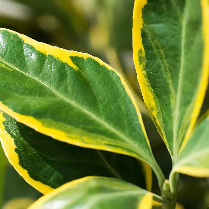 Euonymus japonicus Ovatus Aureus or Marieke and known as Japanese Spindle Bush is a stunning golden variegated evergreen hedging shrub. This plant requires full shade.
