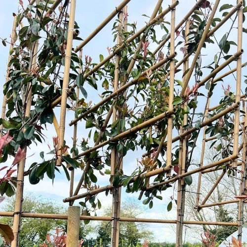 The Red Robin pleached tree is a popular ornamental tree characterised by its stunning glossy green leaves, which take on a vibrant red hue in spring. This tree is often trained into a formal shape, with branches expertly woven together to create a lush, leafy screen or hedge.