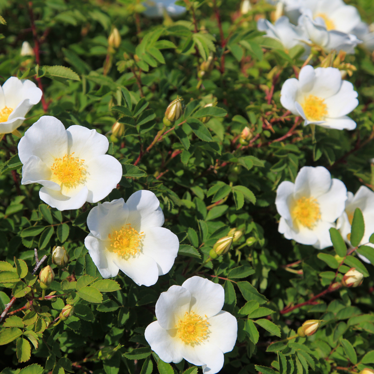 Rosa rugosa Alba (also called White Ramanus Rose) is a fast growing deciduous, dense and bushy rose variety ideal for a summer flowering hedge
